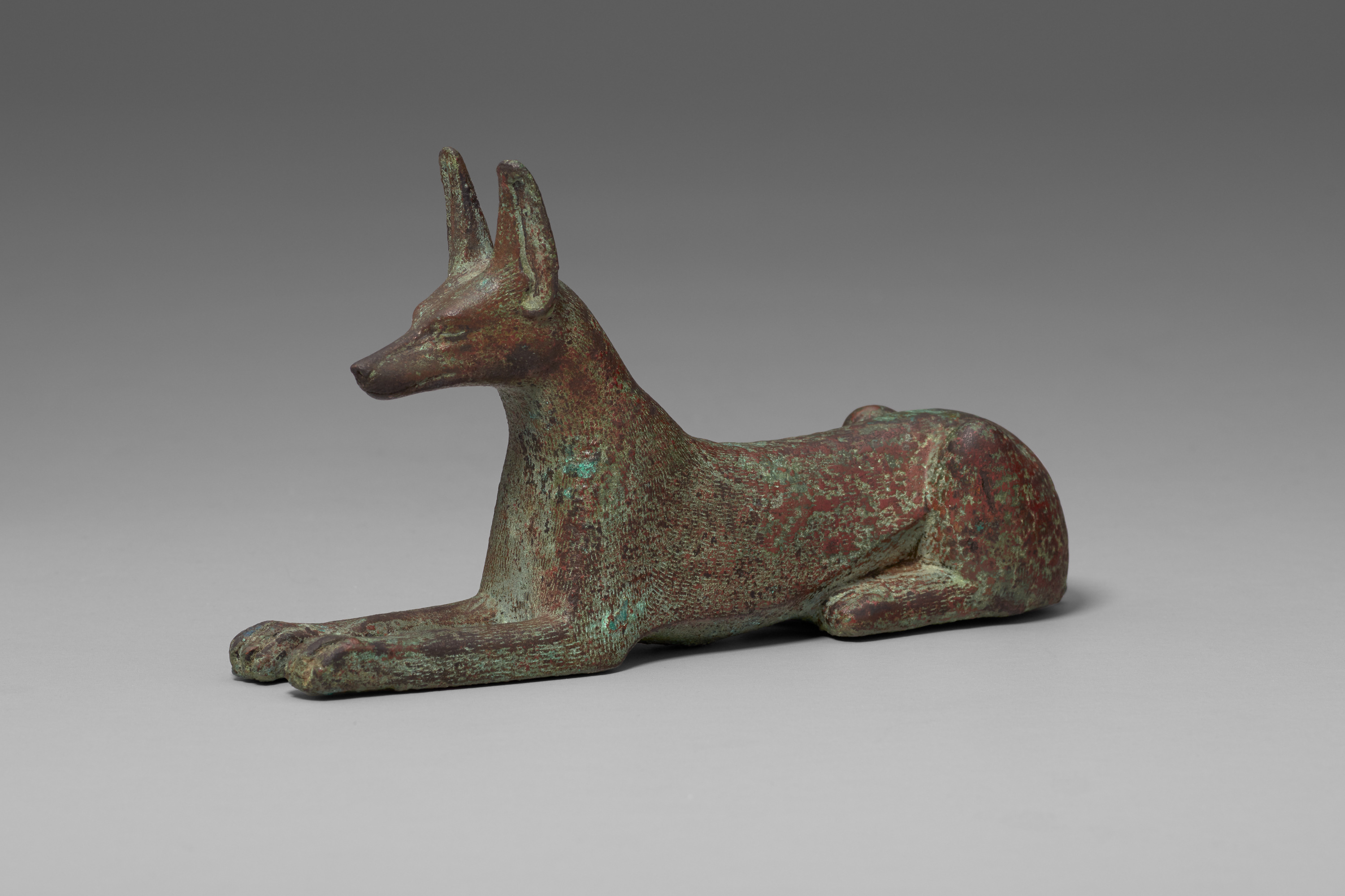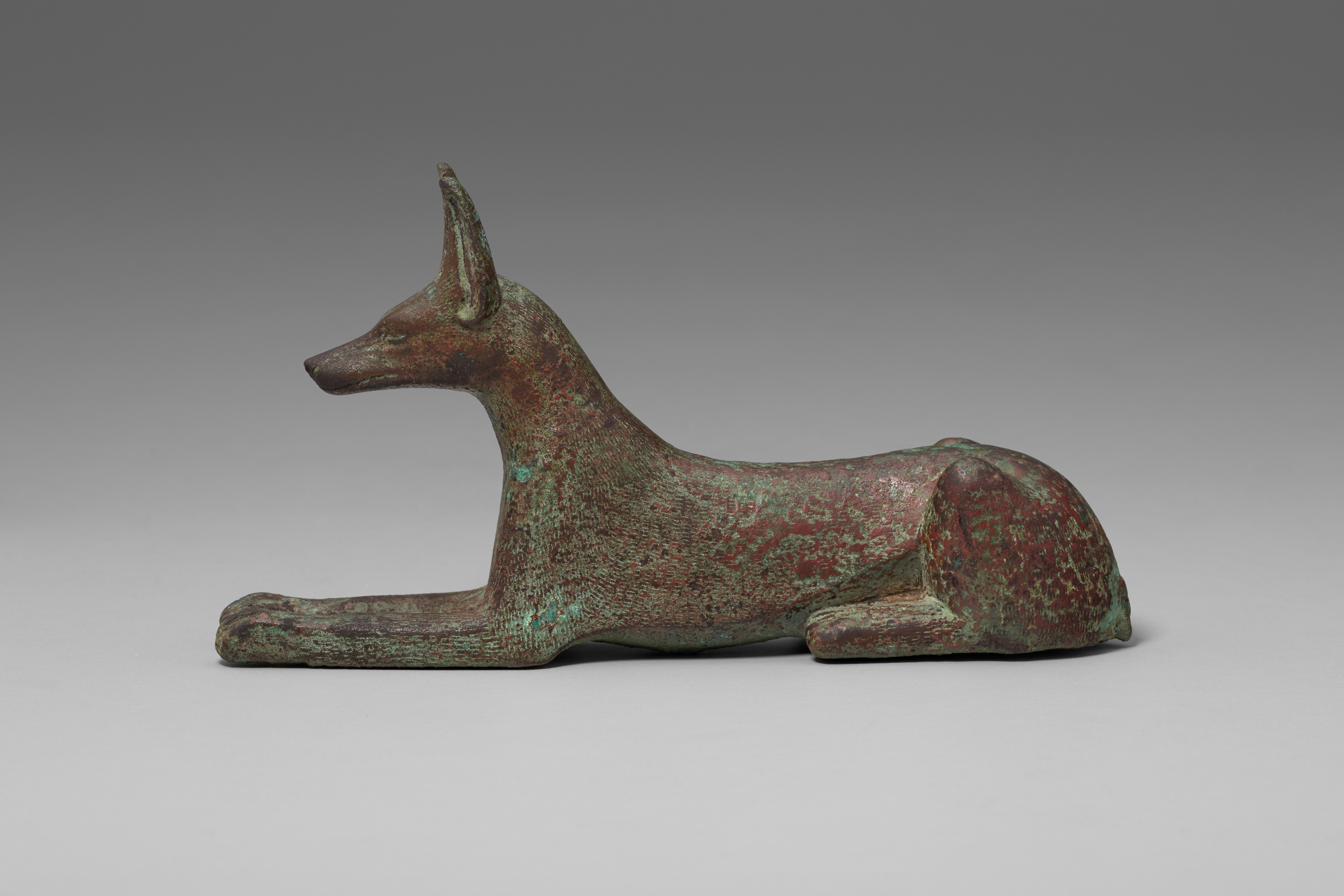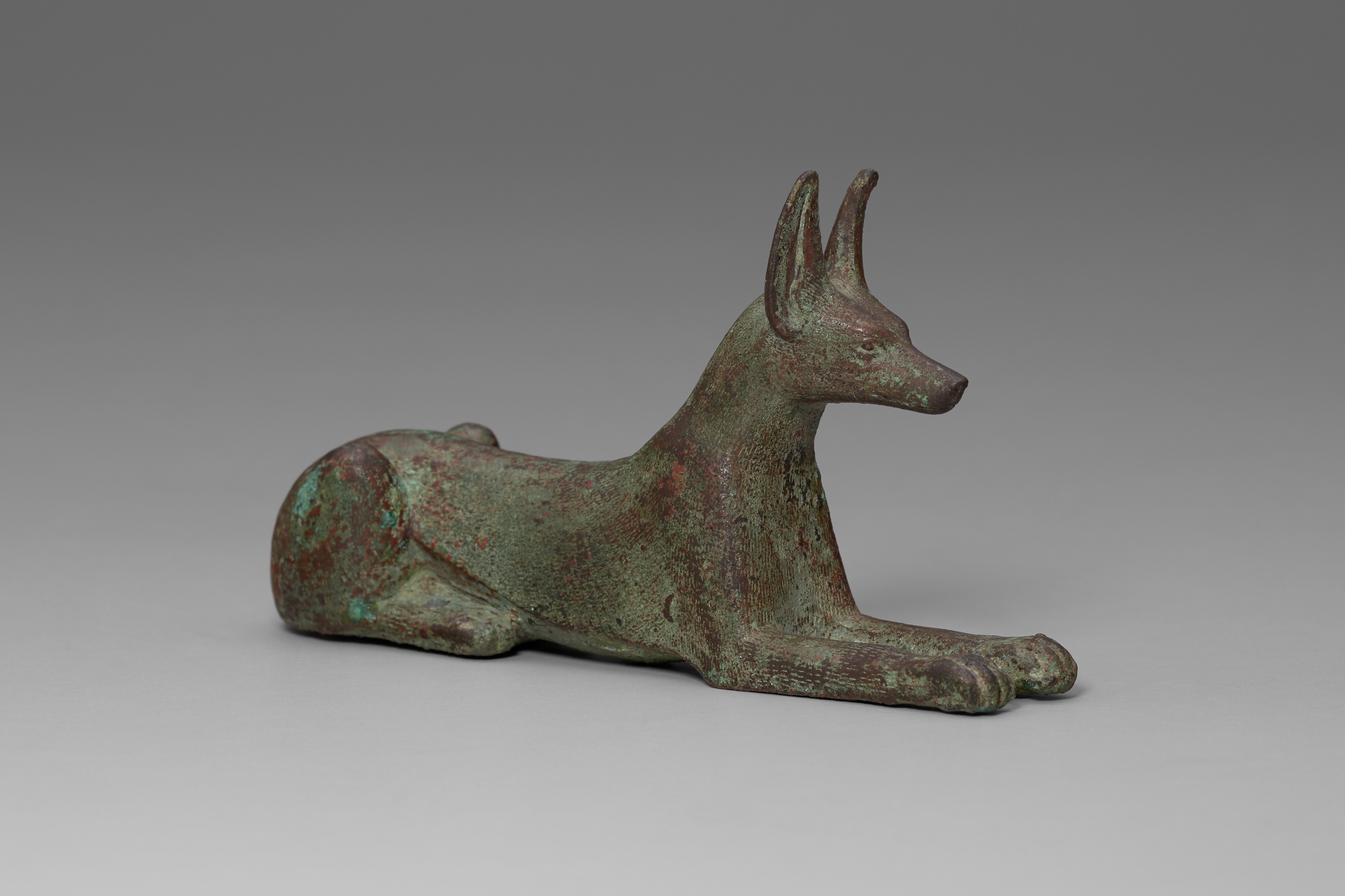 The statuette is exceptional for its excellent workmanship. Recumbent, as opposed to standing, jackal figures in copper alloy are quite rare—most examples are made of wood. The use of copper alloy for this statuette indicates its prestige and, by extension, that of its owner.[1]2