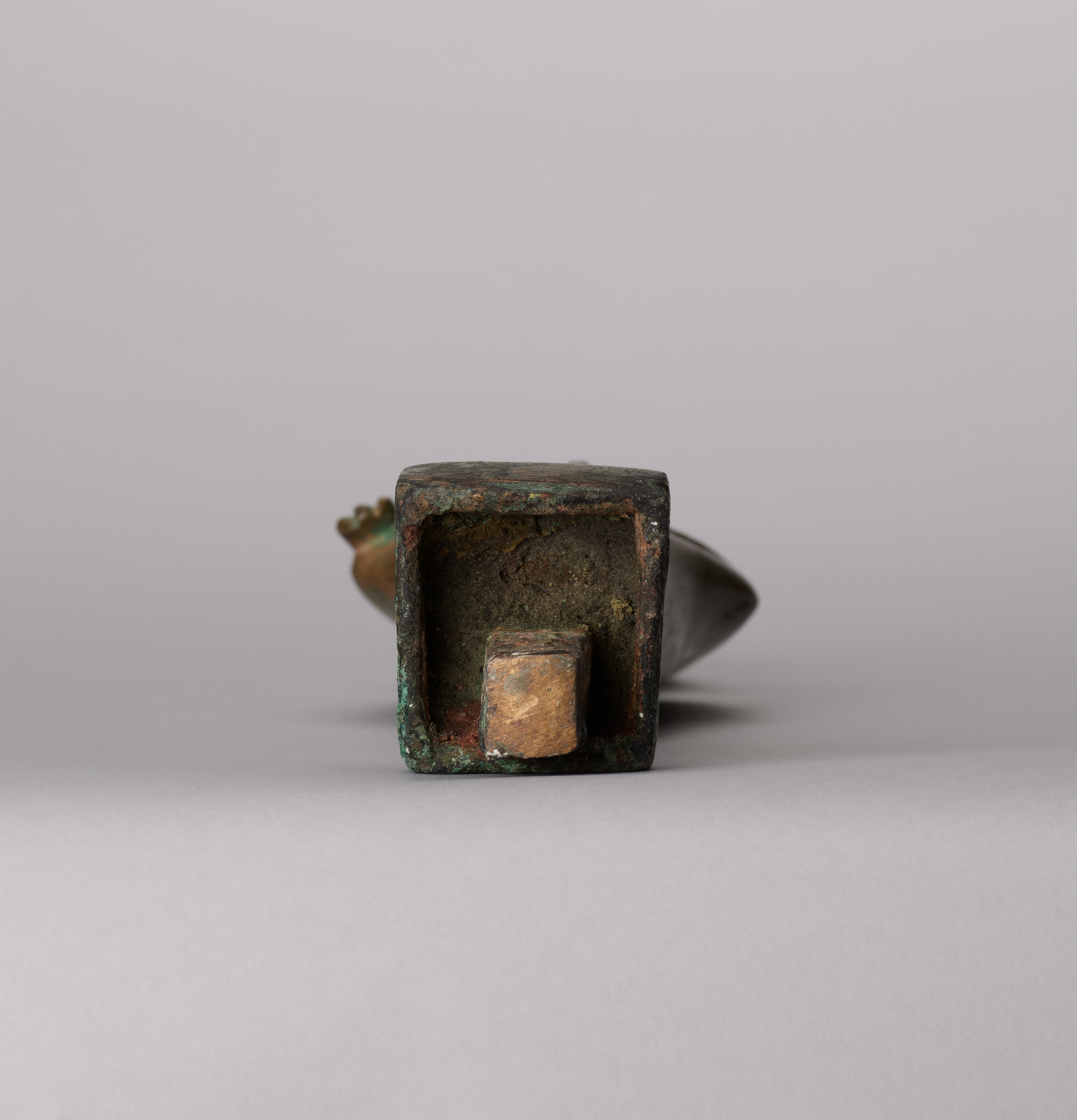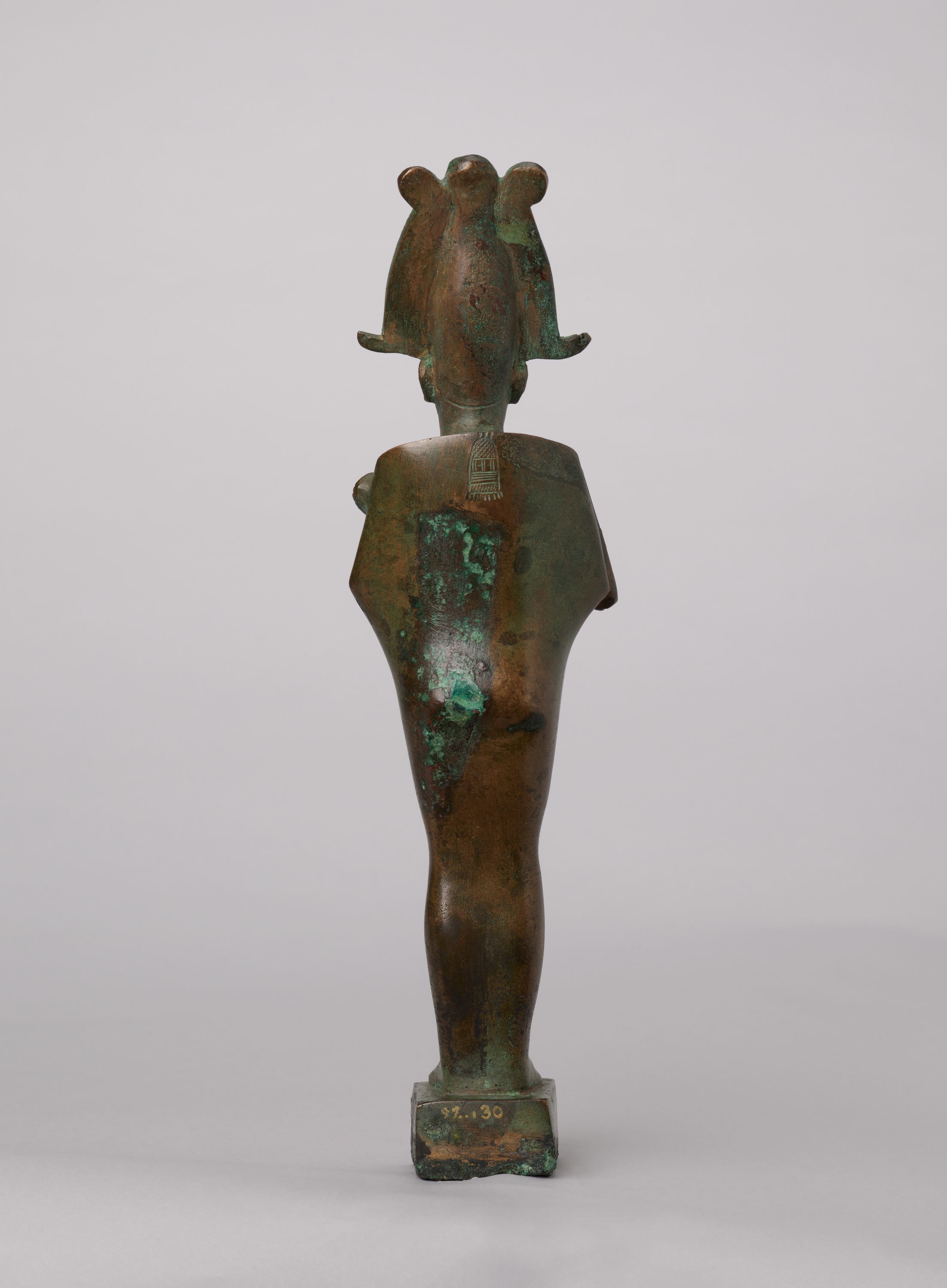 The Chicago statuette is an example of one of the most common versions of Osiris in copper alloy, characterized by the shroud, the hands positioned right above the left, and the long, bent handle of the crook. Such figures may wear the White Crown or the atef crown, with or without horns.[4] This style of figurine appeared in the Third Intermediate Period and continued through the Late Period.[5] In this case, the statuette stands on a rectangular base. A tang on the underside allowed it to be attached to a larger base which is now lost.