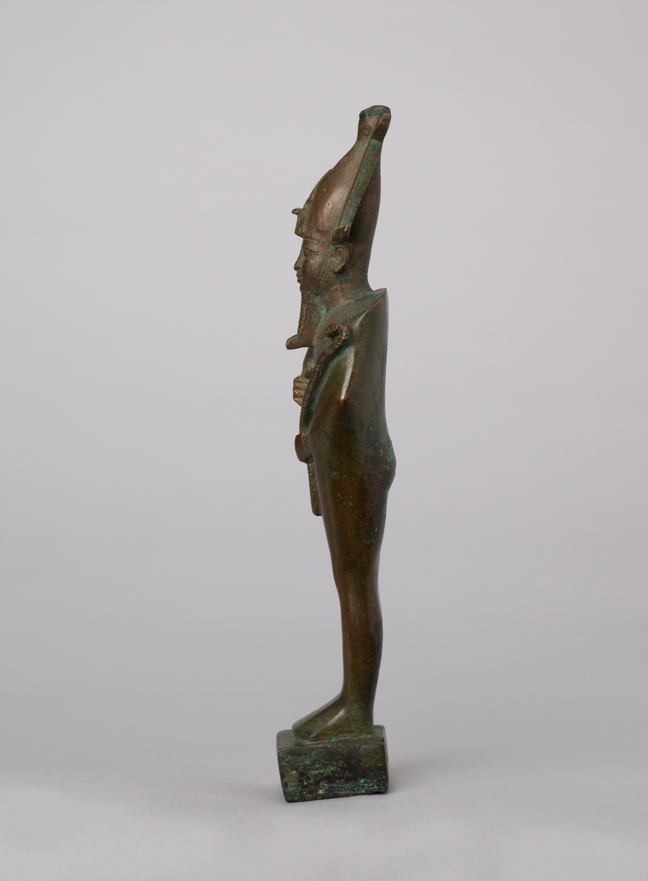 This statuette represents Osiris, the god of the dead. He is immediately recognizable by the mummy wrappings that envelop his body, exposing only his head and hands; his tall crown with uraeus; the long, curved, plaited false beard; and the crook and flail.[1] Although these elements are associated with Osiris there are many variations in the representation of the god.1