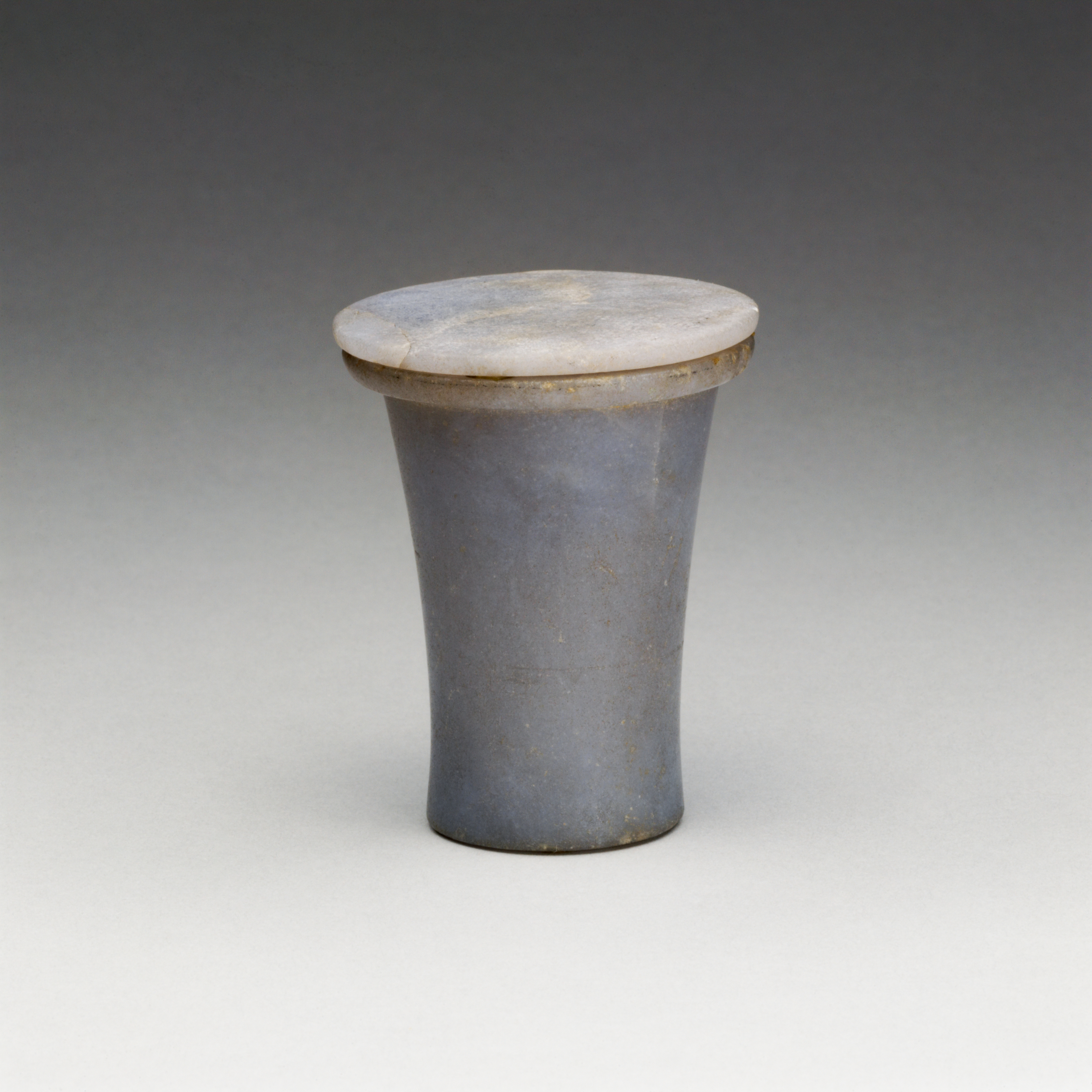 This flaring vessel with a flat disk-lid was for ointment (medjet or merhet). The larger mouth of the vessel made it easier to scoop the ointment out with fingers. The flat lid was secured with a tie.[1] These vessels were commonly made of travertine but also of faience, wood, and other colored stone. Some examples are banded with gold. This example is made of beautiful, blue-gray anhydrite, or “blue marble,” a calcium sulfate that was favored for ointment jars from the Middle Kingdom into the Second Intermediate Period. Its source within Egypt is unknown.[2]1