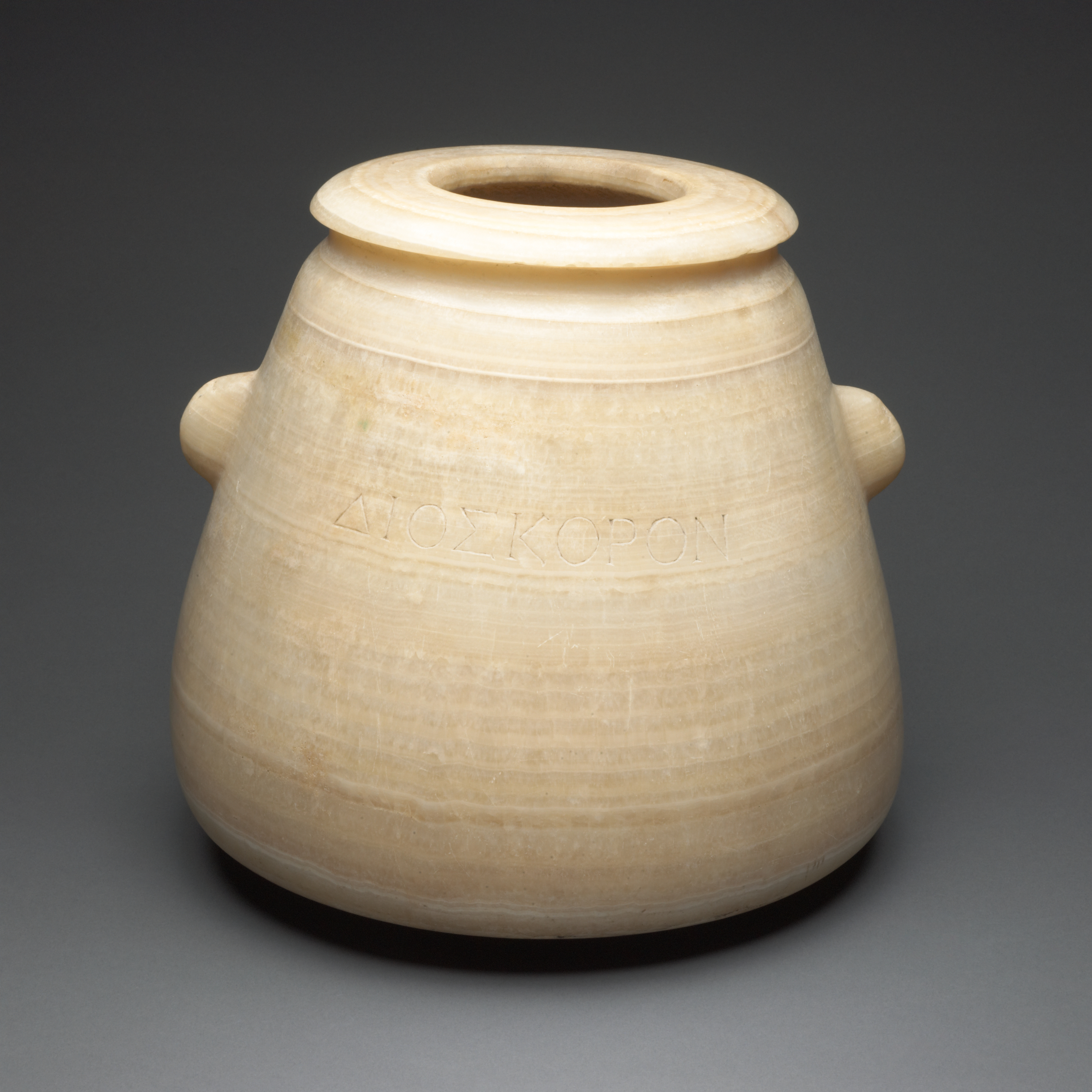 The name “Dioskoron” is incised across the middle of the vessel in Greek letters. It should be translated “[This is the vessel of] the Dioskouroi” (the twin gods Castor and Pollux), suggesting that the vessel was dedicated in honor of those gods in a temple.[1] Castor and Pollux, who in archaic times were worshipped in Sparta and the Peloponnese but who were later attached to an important sanctuary on the island of Samothrace, became the patron saints of sailors.[2]2