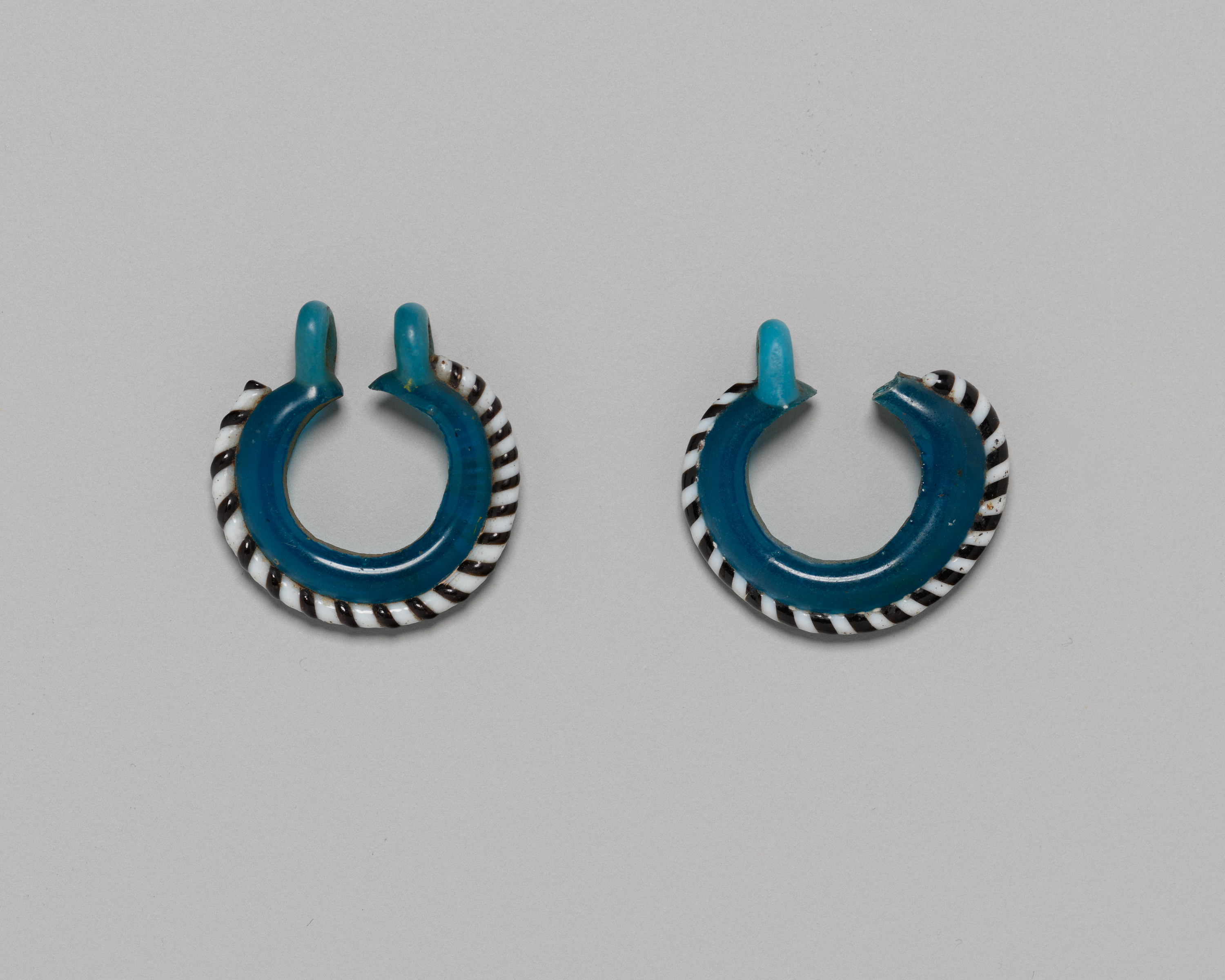 These hoop-shaped earrings are made of translucent turquoise glass that was formed by wrapping the still-soft glass partway around a rod. A dusty gray coating remains on the inner side of each earring, a remnant of that process. While still pliable, a twisted cane of black-and-white glass was fused to the outer rim of the turquoise glass. The loops at the top of the earring secured a wire that passed through the earlobe.1