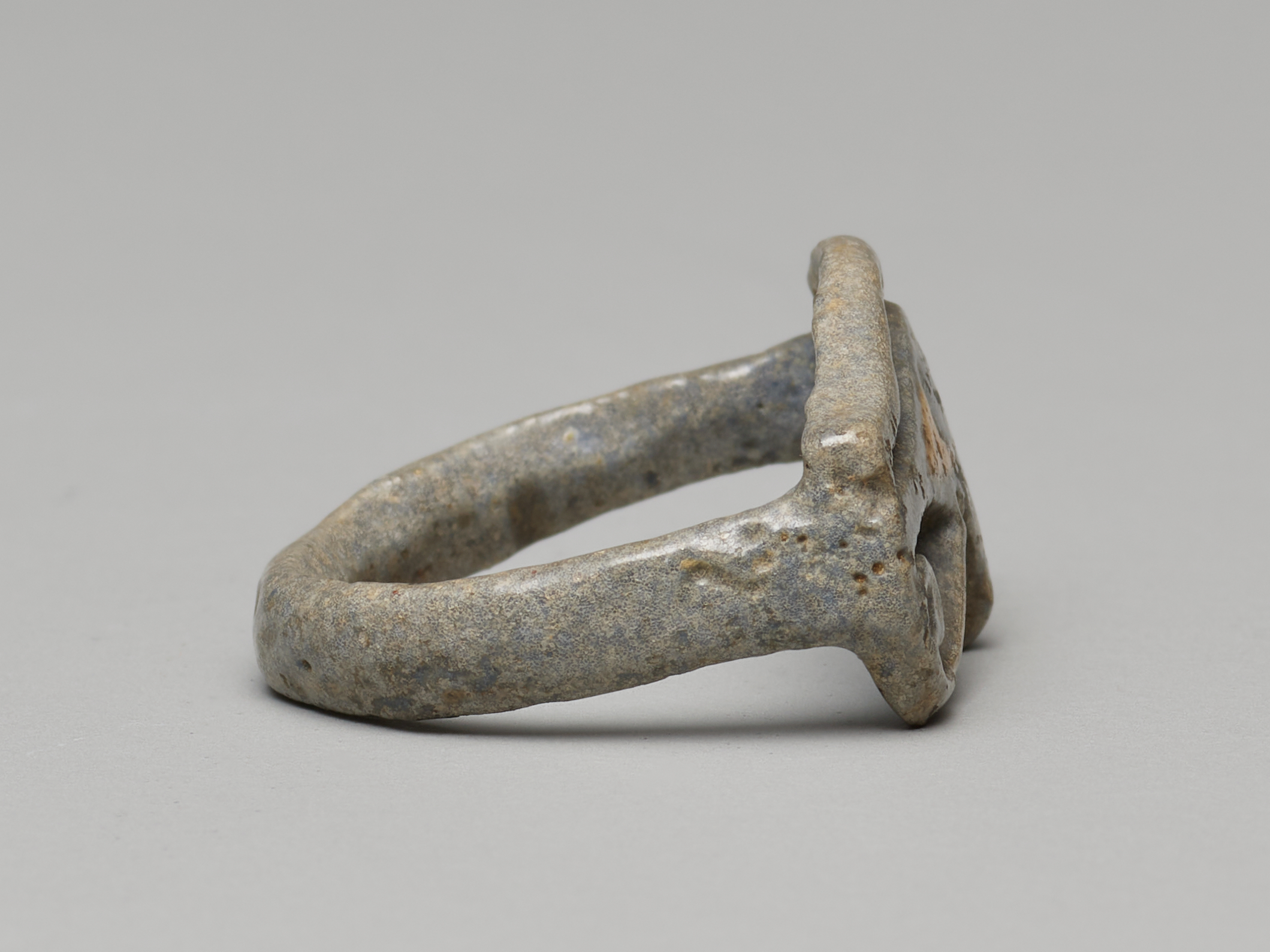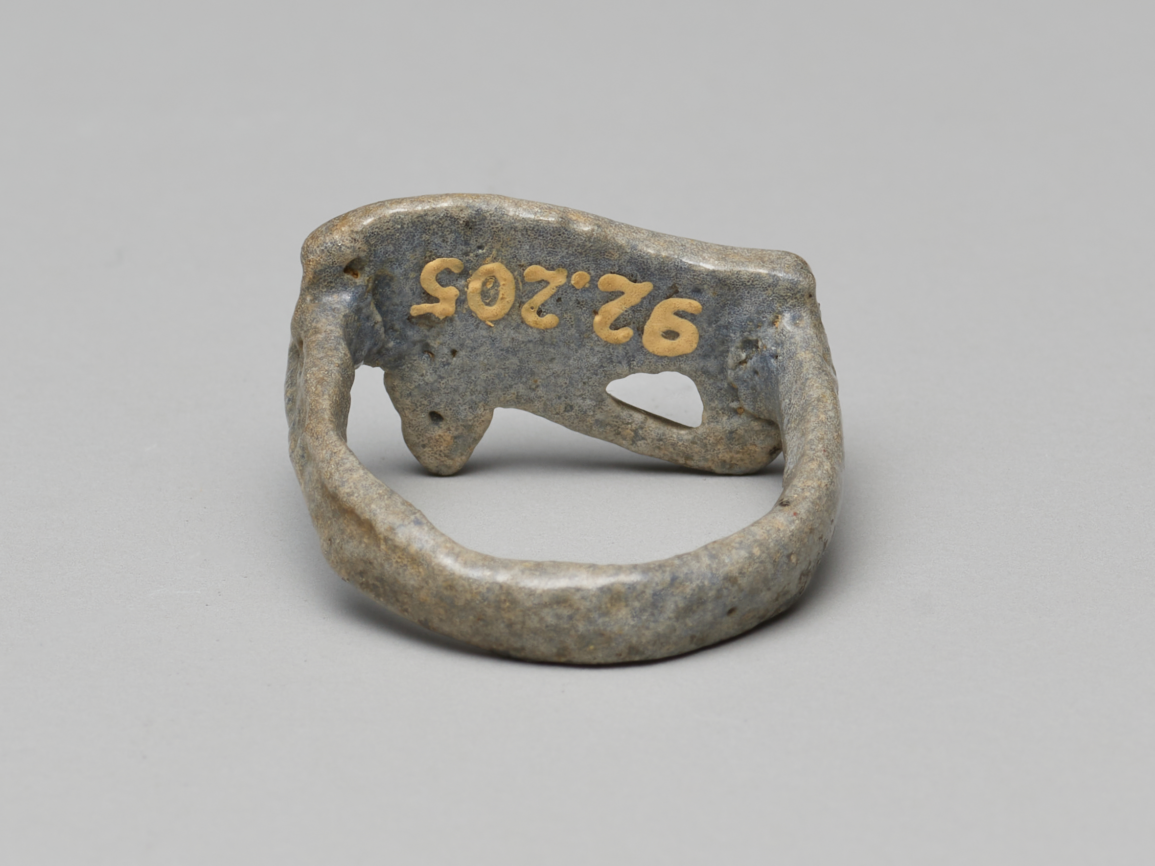 Faience rings like this example were mold made, with the decorated bezels and plain bands formed separately and then joined using a slurry. Fired clay molds for ring bezels and bands have been found in great numbers at sites including Akhetaten (now Tell el-Amarna), the royal city of King Akhenaten (reigned about 1352–1336 BCE) in Middle Egypt, giving insight into the manufacturing process and attesting to the popularity of this type of jewelry for a broad swath of the population during the New Kingdom.[3]3