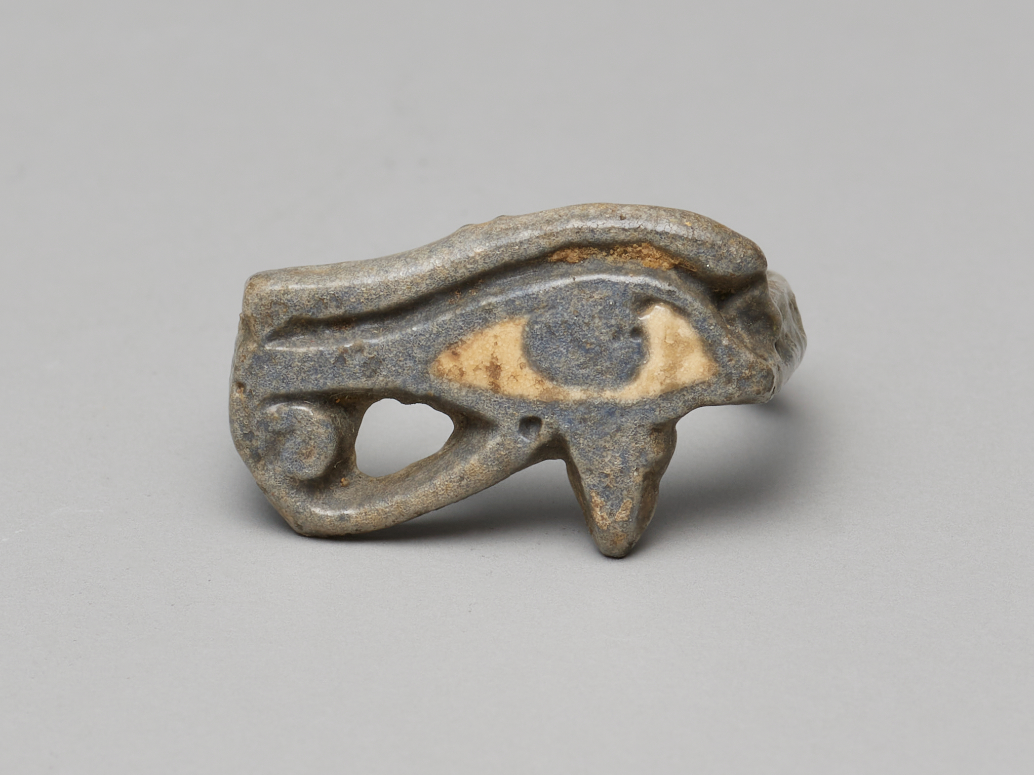 According to myth, in one of many contests that took place during Horus’s decades-long struggle against his uncle Seth for the throne of Egypt, Seth tore out the young god’s eyes. Thoth, the god of wisdom, restored Horus’s eyes, making them whole (wedjat) once more. When written as a hieroglyph, the wedjat takes the form of a human eye and eyebrow with a cosmetic line extending from the eye’s outer corner. The shapes below the eye—a vertical drop and a diagonal line that terminates in a spiral—evoke the facial markings of a lanner falcon, a reference to Horus’s falcon (or falcon-headed) form. (For more on the symbolism of the wedjat, see cat. 92.)2