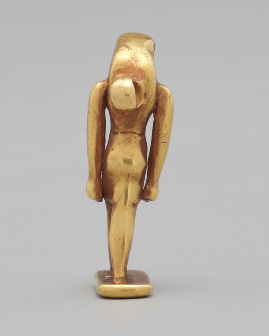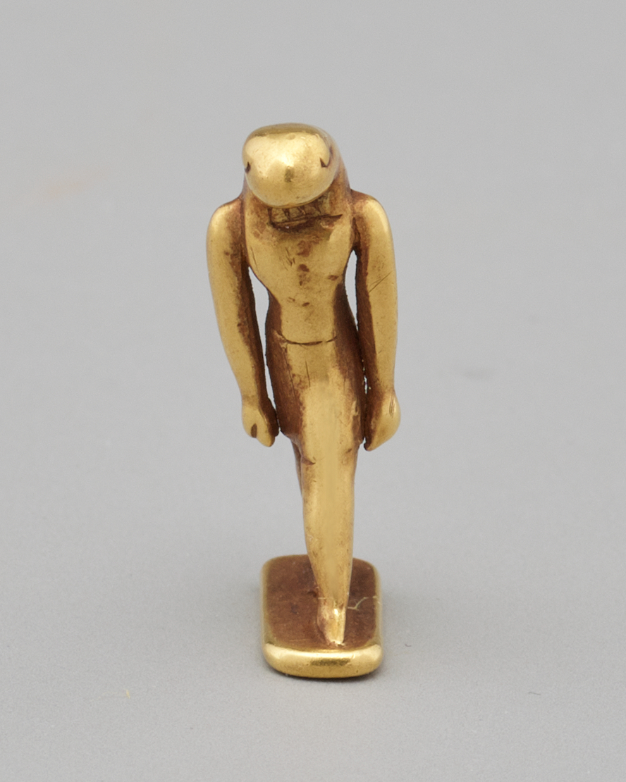 This finely made amulet shows a snake-headed man with his arms at his sides and his left foot advanced. He stands on a rectangular base with rounded corners. There is a suggestion of a tripartite wig under his serpent head. His eyes are oval-shaped. Even in this diminutive scale, the artist has portrayed the idealized body of a man in the prime of life, with a broad chest, narrow waist, and long legs. He wears a knee-length kilt that emphasizes his round buttocks. His tiny hands are curled into fists and his thumb is prominently shown.1