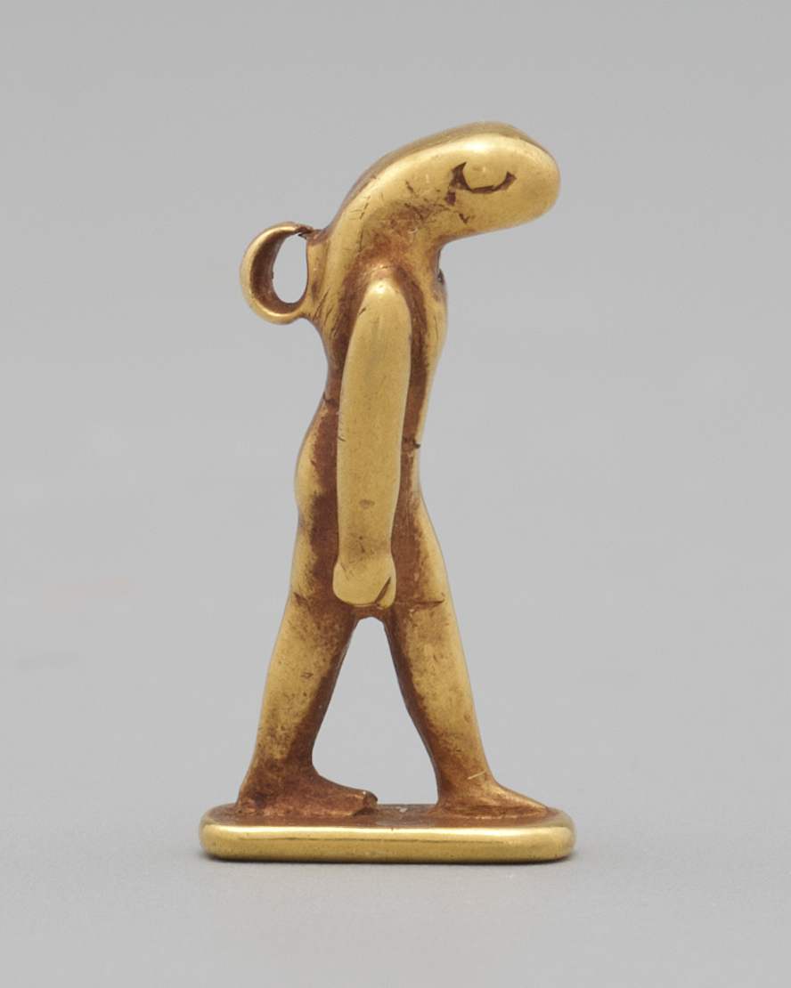The date given for this piece is based on a comparison of Late Period gold amulets to those of the later Ptolemaic Period. This finely detailed example was most probably cast, while most gold amulets of the Ptolemaic age were stamped of thinner sheets of gold. A good parallel for the Chicago example is a solid-gold figure with an erect phallus from the Groppi collection.[3] It shows the same level of craftsmanship, it is about the same height (1.8 cm), it has the same idealized body with the same degree of detail, and it has the same style of loop on the shoulders. In the sale catalogue for the Groppi collection, the amulet was dated to Dynasty 6 on the basis of a somewhat-similar bone amulet dated to the Old Kingdom (although this early date seems very unlikely).[4] Elsewhere, the Groppi amulet was assigned a more plausible date of “surely after 1000 B.C.,” which also seems appropriate for the Chicago amulet of Nehebkau.[5]3