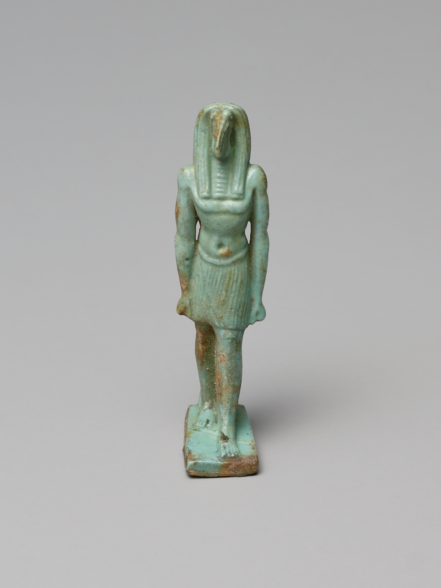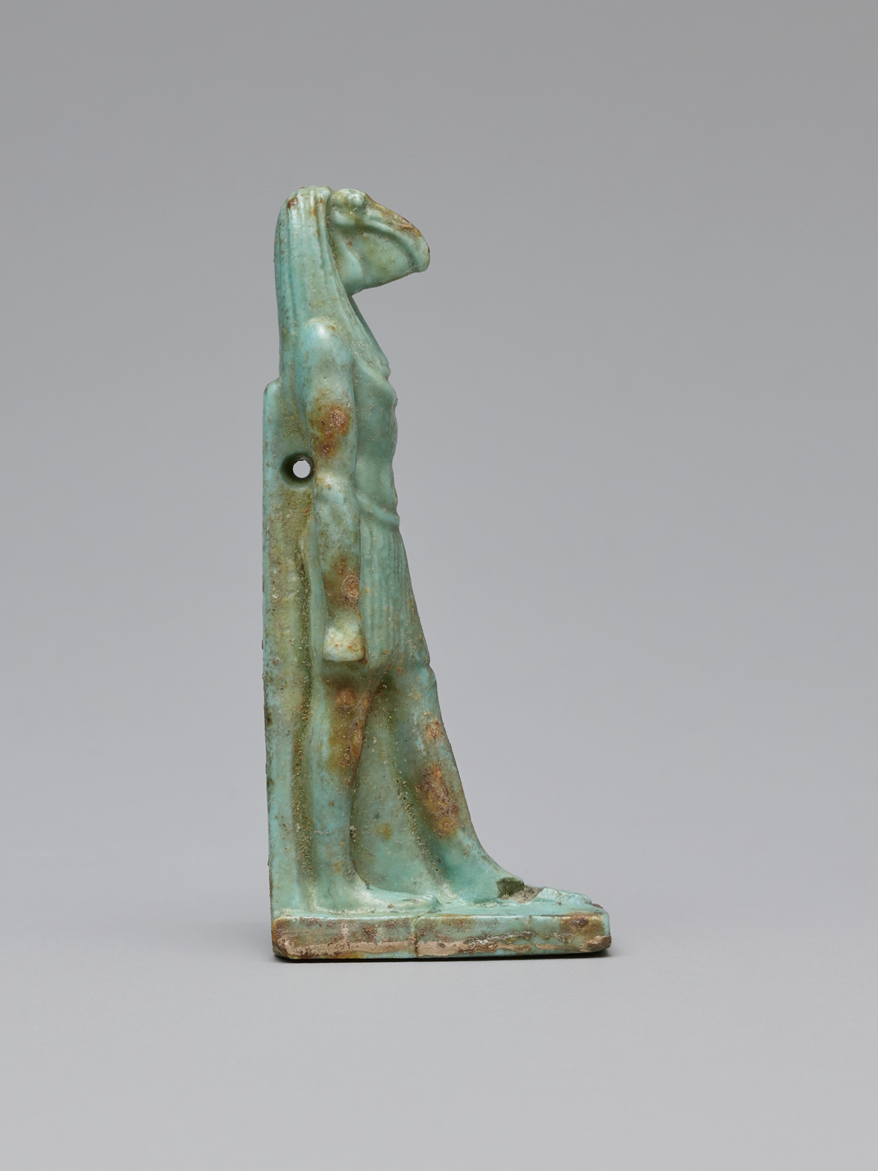 These amulets are two very different representations of Thoth, the god of wisdom. One, of light green, glazed faience (cat. 82), shows him as a standing man with the head of an ibis. He wears a tripartite wig, a broad collar, and a knee-length pleated kilt. He is shown in classic Egyptian fashion, with broad shoulders, toned abdominal muscles, a narrow waist, arms at his sides, and his left foot extended. Even in its small scale, this amulet manages to portray the musculature of the legs and arms and the details of the hands and feet. Like a miniature statue, it has a back pillar and a pedestal base. It is pierced at the level of the neck to be strung or attached to the mummy.