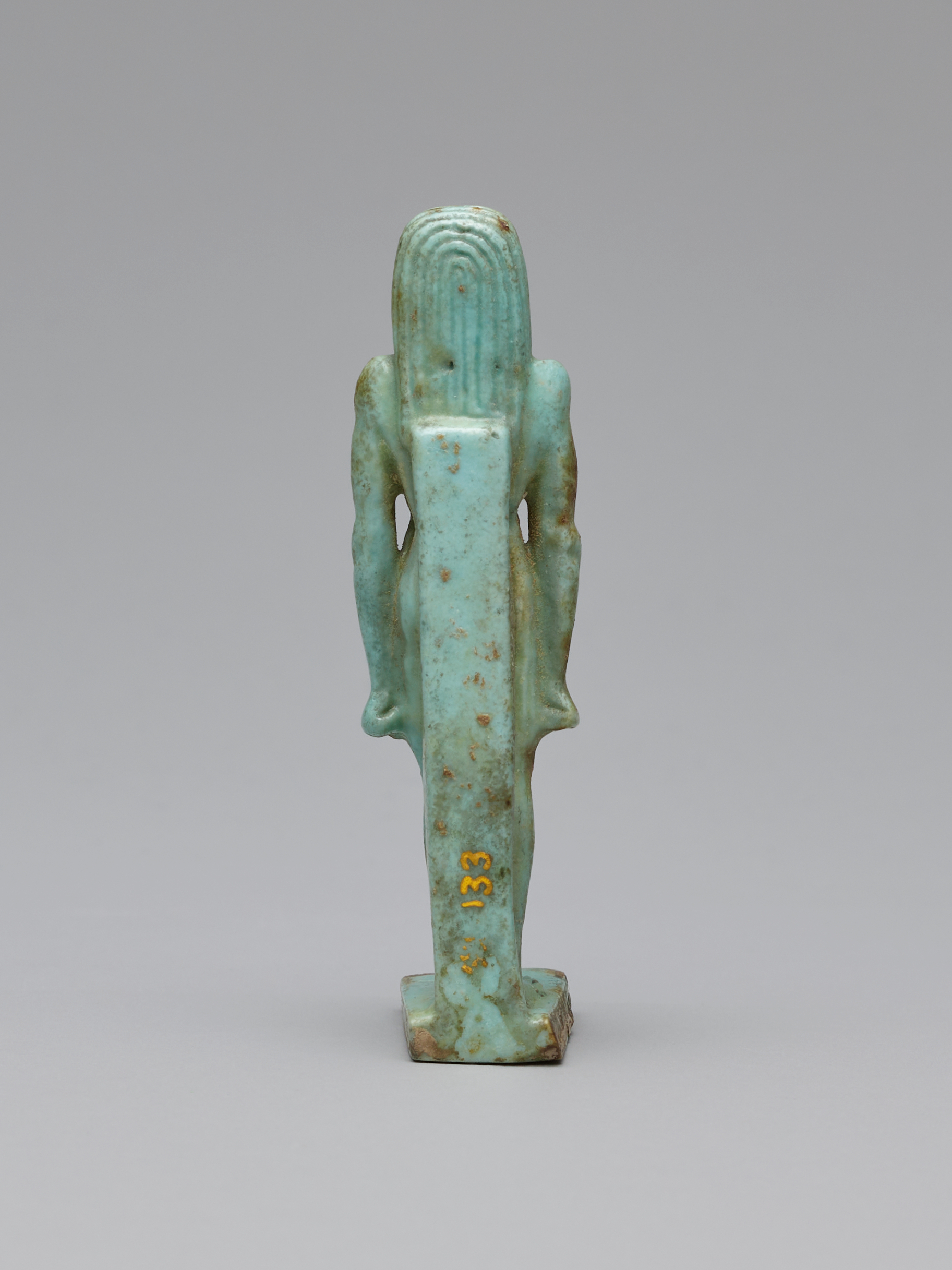 The other amulet (cat. 83), sculpted from steatite (also known as soapstone) and covered with green glaze, shows Thoth as a squatting, hamadryas baboon (Papio hamadryas), his chest and back covered with a shaggy coat.[1] He has a long muzzle and deep indentations along his nose. His front paws rest on his knees. His prominent phallus is visible between his legs and his tail curves around his right side. His head is topped with the lunar disk in its waxing and waning forms (see cat. 29 for more on the lunar disk), signaling his association with the moon. A loop of steatite carved at the juncture of the top of his head and the lower part of the disk allowed the amulet to be strung or sewn to another surface.2