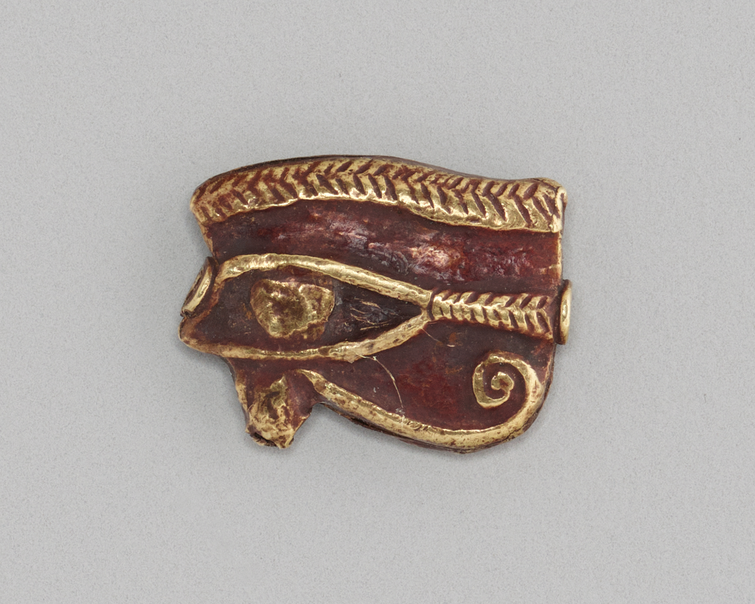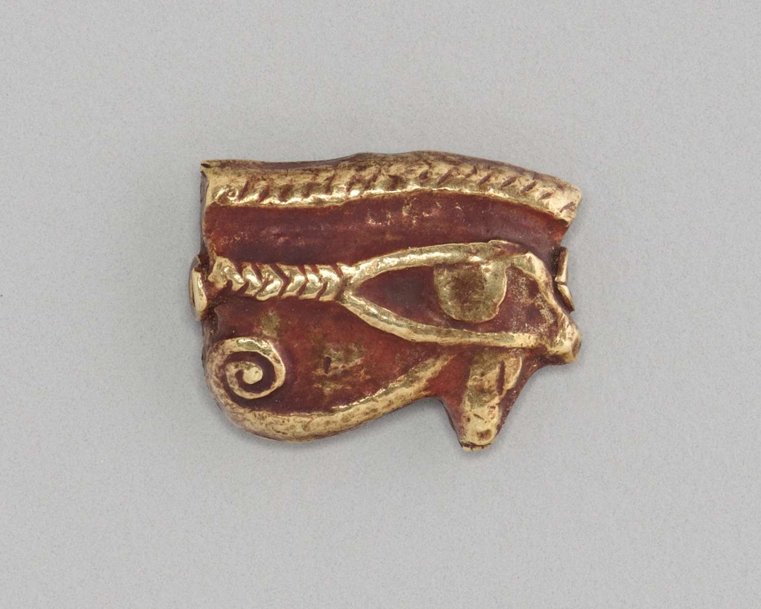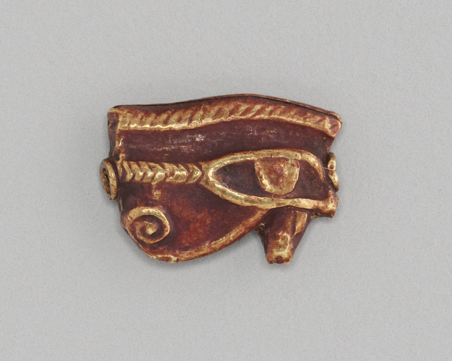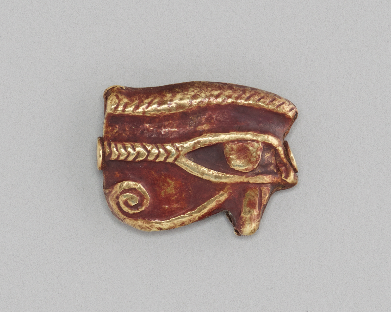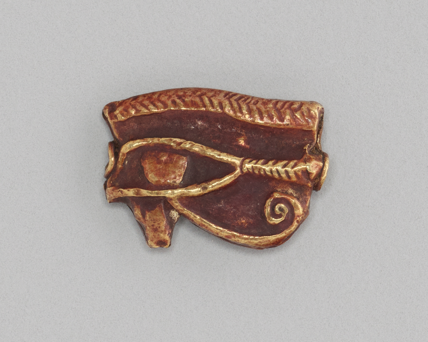 This set of gold wedjat eyes were each made of two sheets of gold that were probably pressed into a mold to produce the overall design. The sheets were then joined, perhaps with solder, to make a double-sided eye. A flattened rim on both edges of the eye, just above the inner canthus and at the end of the cosmetic line, surrounds the piercing that would accommodate a cord or thread to allow the amulet to be strung as jewelry or attached to a mummy.3