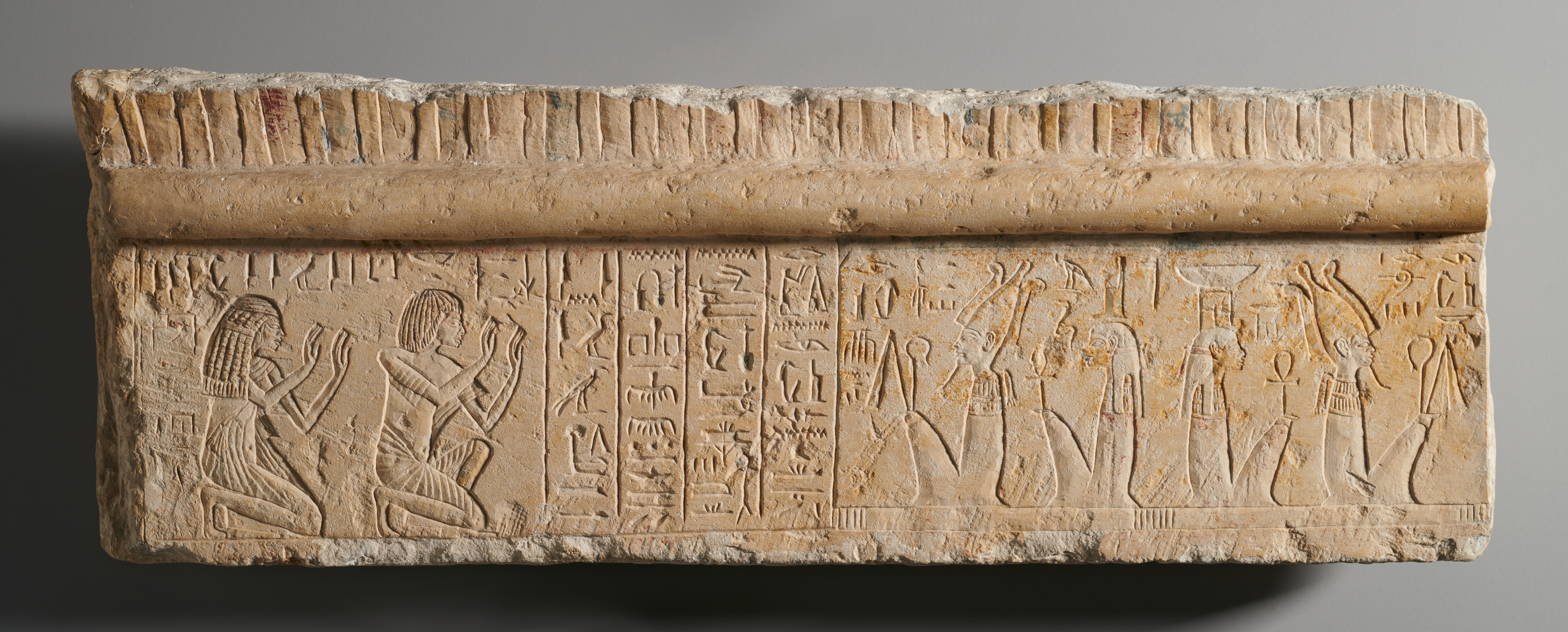 Like many ancient Egyptian objects, this fragment of a lintel came from a tomb; this particular lintel was once part of the tomb chapel of an official named Iniuia. The upper section is carved in the form of a curved cavetto cornice that topped many ancient Egyptian doorways. This architectural element represents the unbound fringe of woven mats that formed the walls of many ancient buildings. Here, the cavetto has traces of red, blue, yellow, and black pigment.1