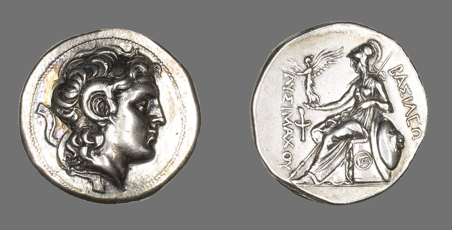 Alexander the Great was shown on currency with horns curling around his ears, furthering his claim that he was the son of the Egyptian god Amun. Tetradrachm (Coin) Portraying Alexander the Great, 297–281 BCE, issued by King Lysimachus of Thrace. Greek; minted in Ephesus, Asia Minor (now Turkey). Silver; diam. 3.1 cm (1 1/4 in.). The Art Institute of Chicago, gift of Martin A. Ryerson, 1922.4924.