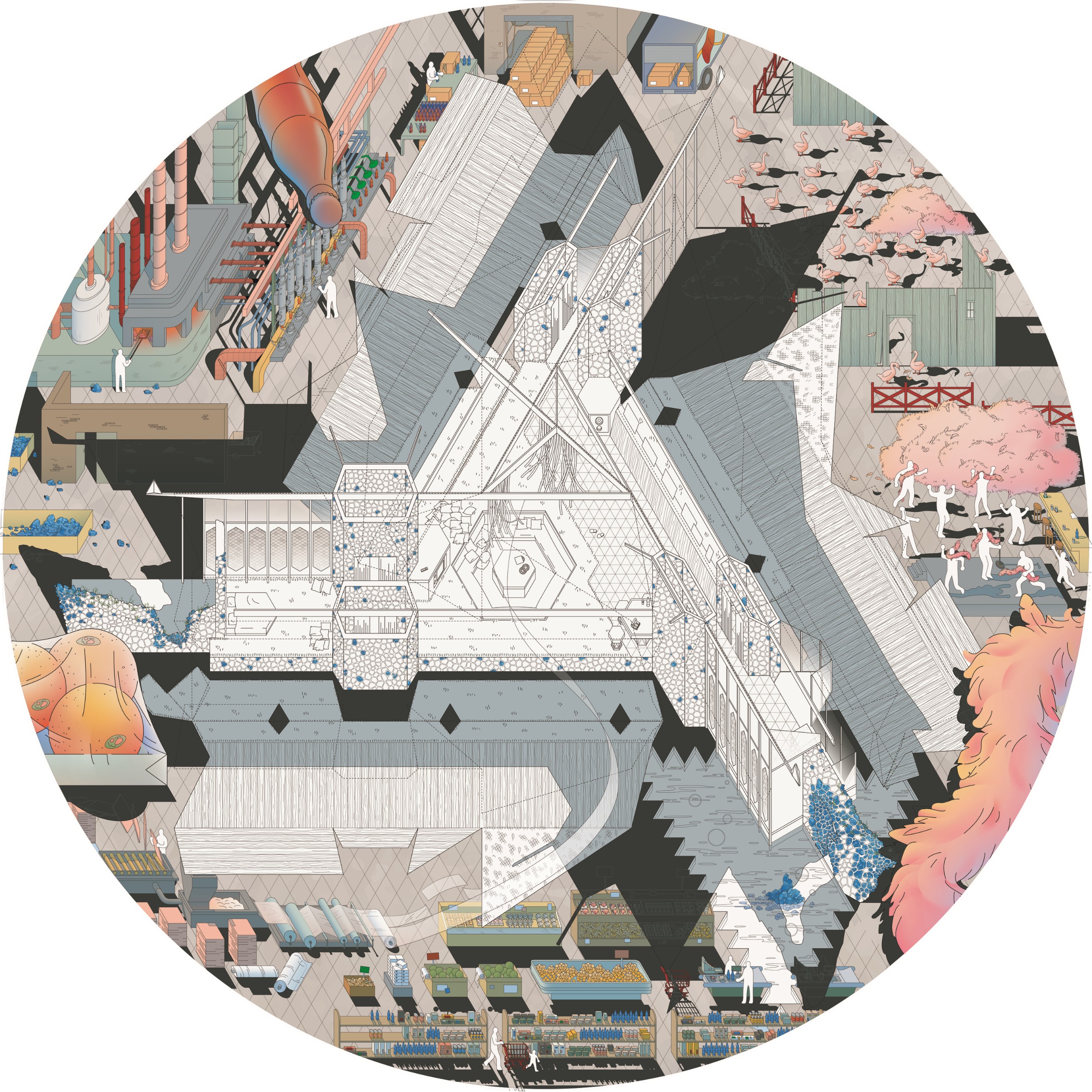 Recently acquired by the Art Institute of Chicago, Diamantopoulou and Kolb’s composite drawings illustrate the unique form of each house—triangle, dome, and logarithmic spiral—through simple, black and white floor plans and sections based on drawings by Goff at the Art Institute. Around these linear drawings, the architects layered fanciful vignettes about Goff’s materials that explode with color, action, and whimsy.