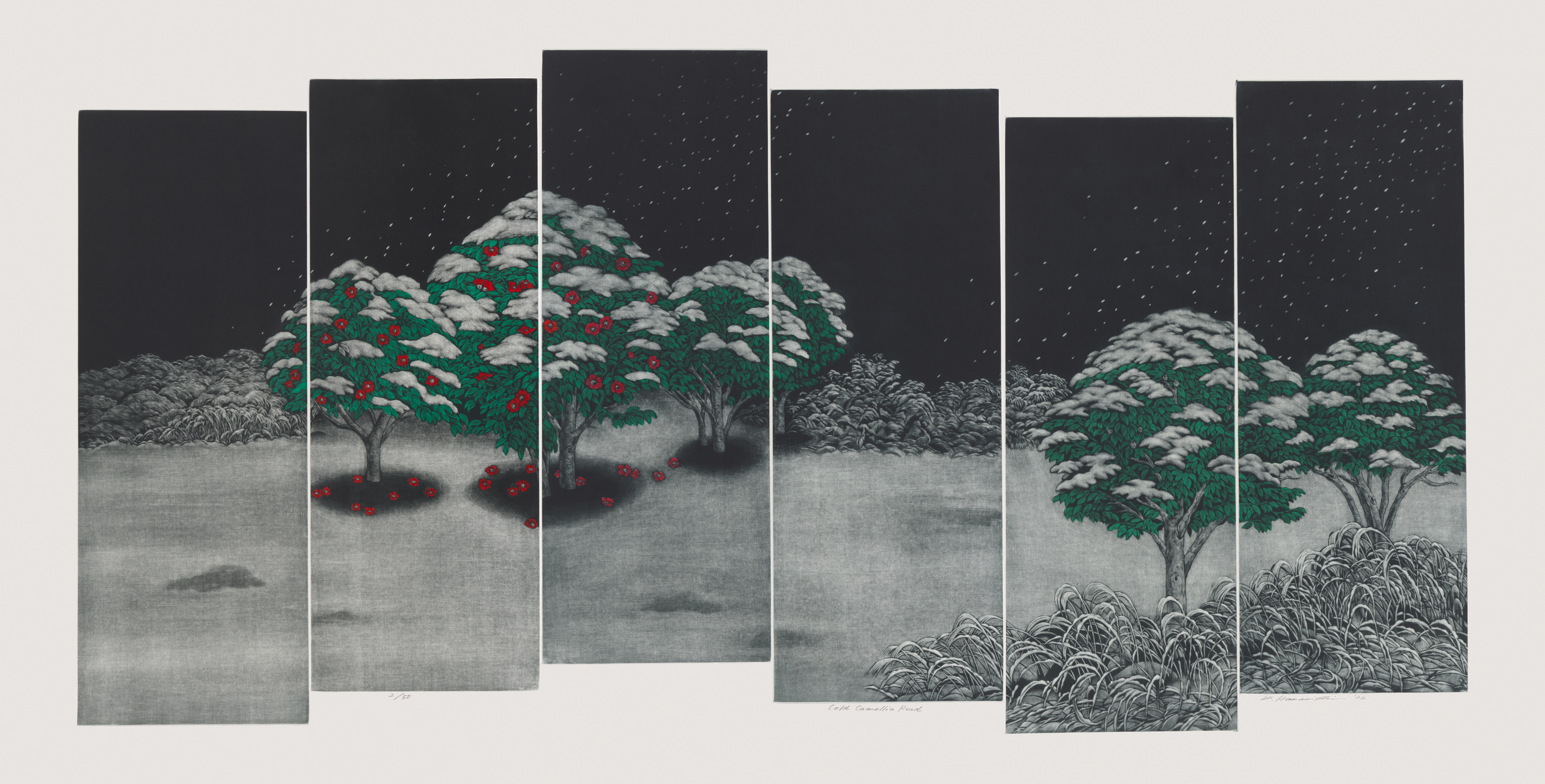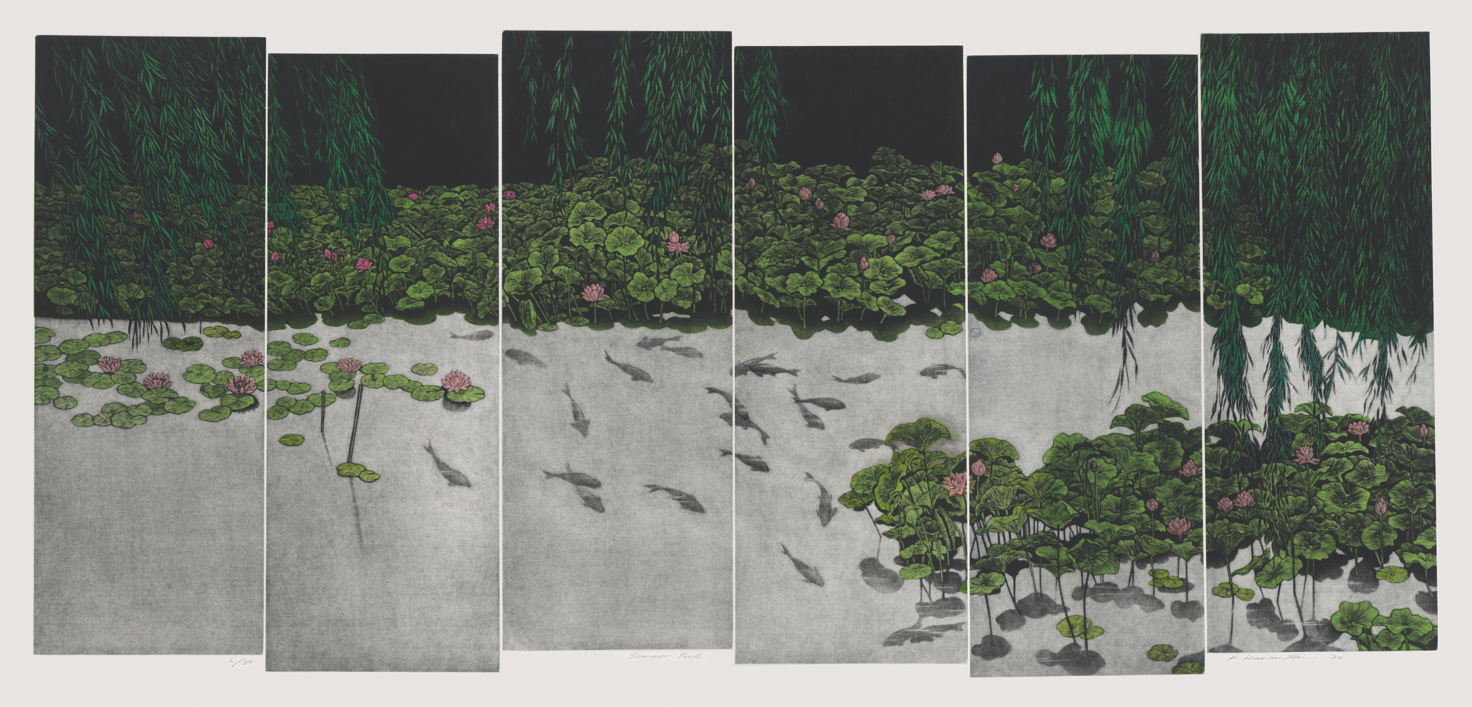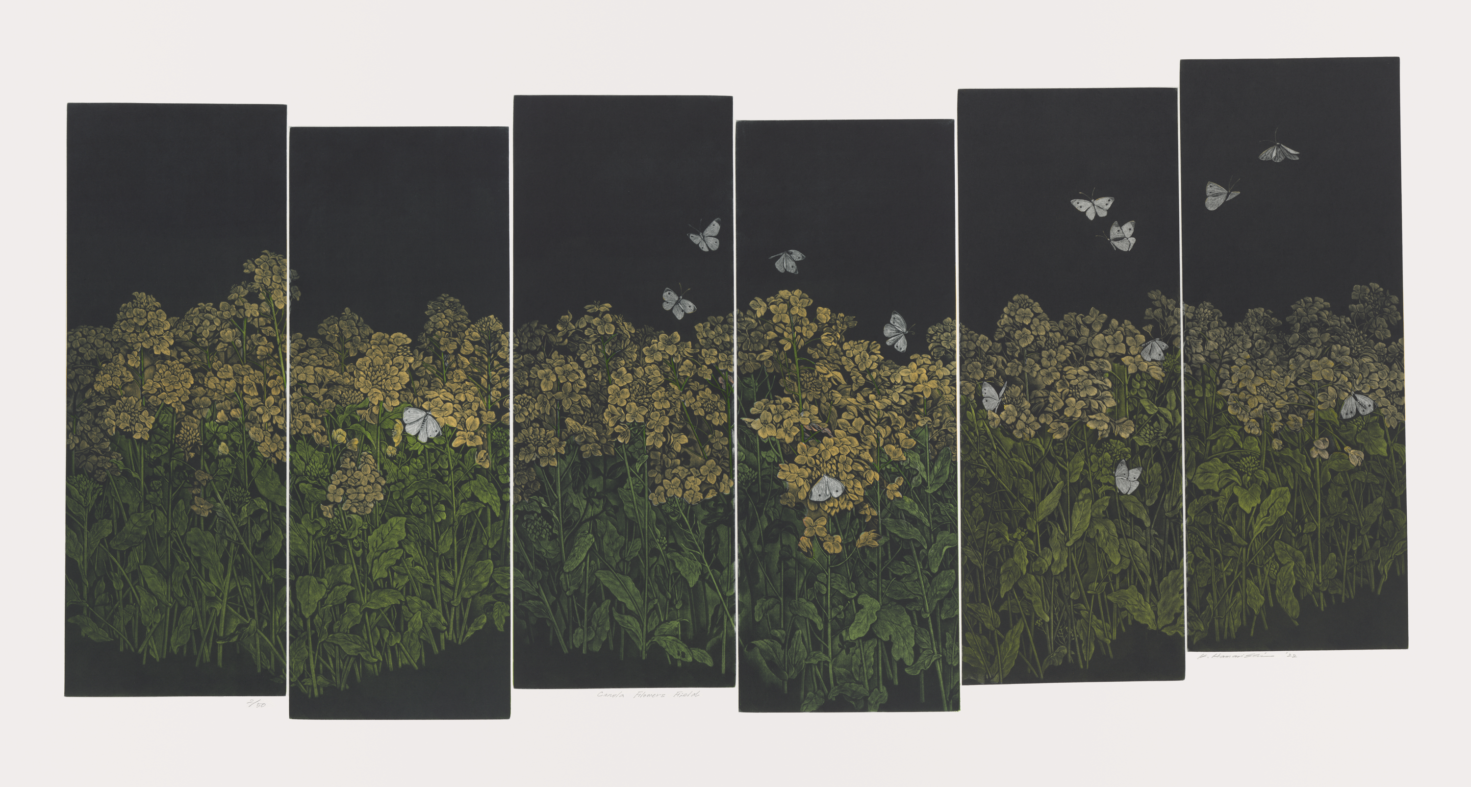 The exhibition also celebrates several important gifts to the museum. Hamanishi’s 2022 Four Seasons series—shown here for the first time—is a recent gift from the artist. Each work in the series is reminiscent of the panels of a folding screen and features seasonal floral imagery.