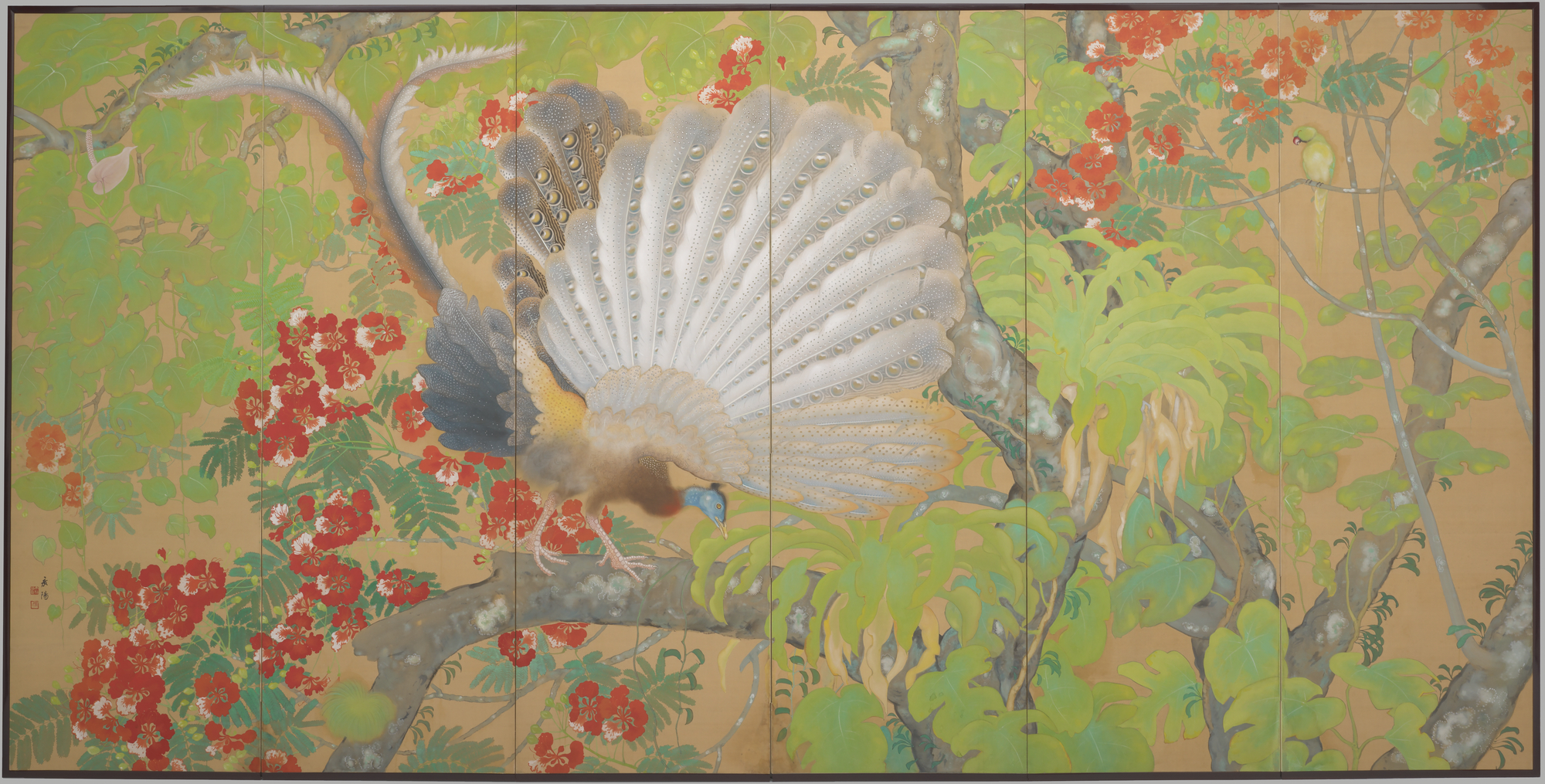 Ōmura Kōyō was a star of his generation. Born in Fukuyama, he graduated from the Kyoto Municipal School of Painting in 1914 and became the pupil of Takeuchi Seihō (1864–1942), a renowned master of Nihonga, or traditional Japanese painting. From 1912 until World War II, Ōmura showed regularly at Japan’s premier exhibitions. He also displayed his work to admiring audiences in France, Germany, and Italy, gaining an international popularity that was rare for Japanese artists at the time. This pair of six-paneled screens by Ōmura presents a close-up view of a lush tropical forest inhabited by a bird species known as the great argus. A pair on the right perches calmly, in contrast with the active male bird on the left, who is engaged in a mating dance and fans his patterned feathers out across multiple panels. The whole work also features the bright red-and-orange blossoms of the royal poinciana flower. The artist observed this wildlife during a trip to the Dutch East Indies (present-day Indonesia).